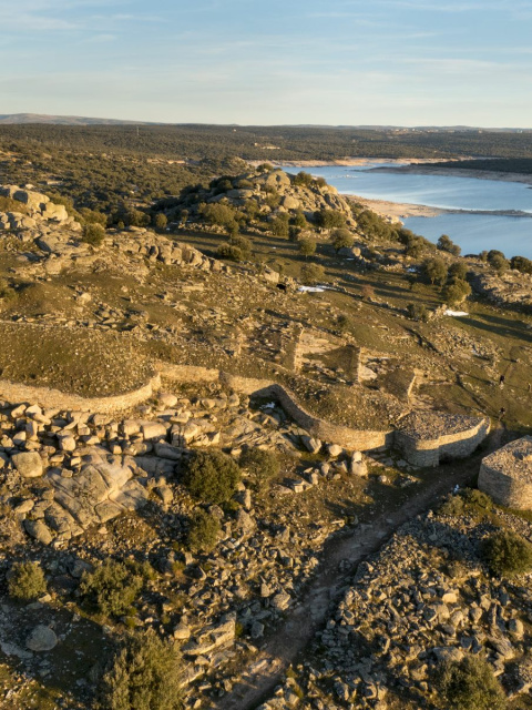 Está protegido por un doble recinto amurallado y un campo de piedras hincadas para impedir la llegada de caballería.
